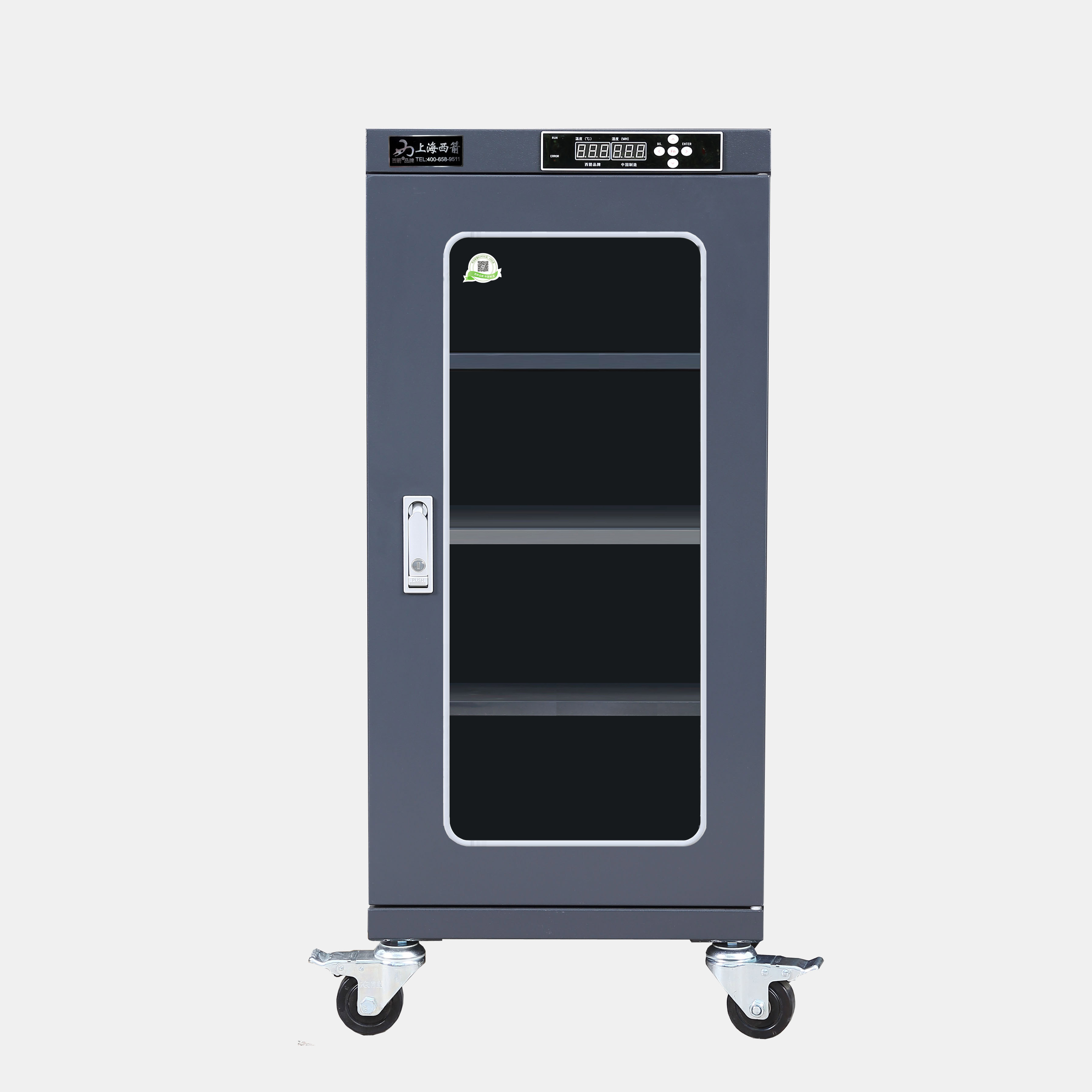 3.防潮箱門玻璃區(qū)域選用3.0mm鋼化玻璃,防前傾耳式結構設計。帶平面加壓把手鎖*體化設計,有防盜功能。**部安裝可移動帶剎車腳輪方便移動及固定(防靜電機型腳輪為防靜電)。