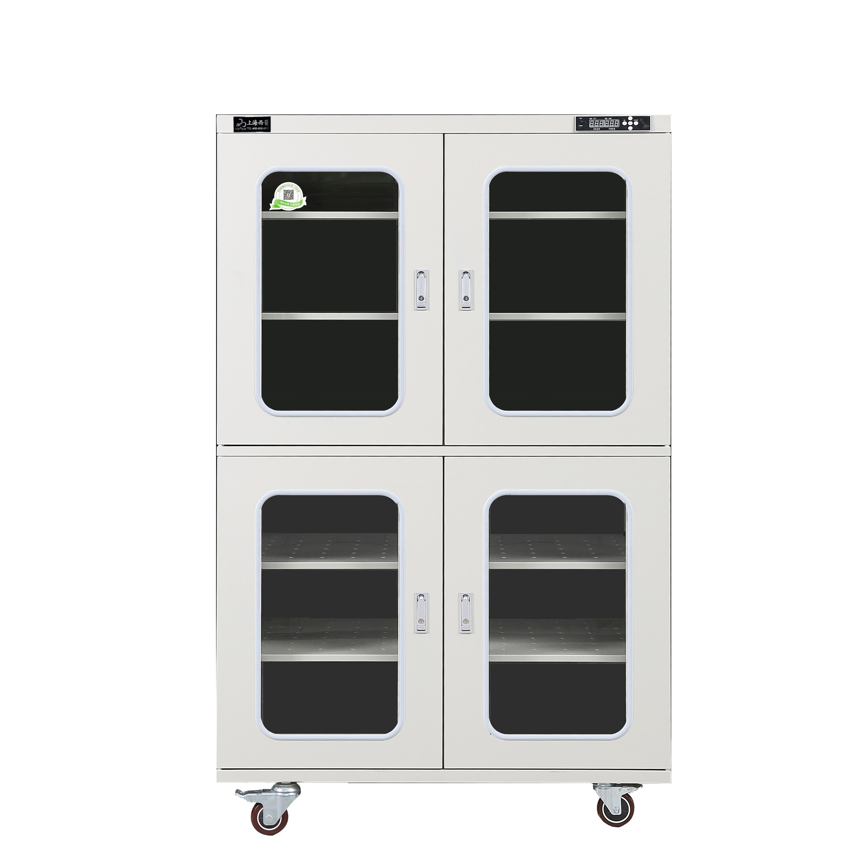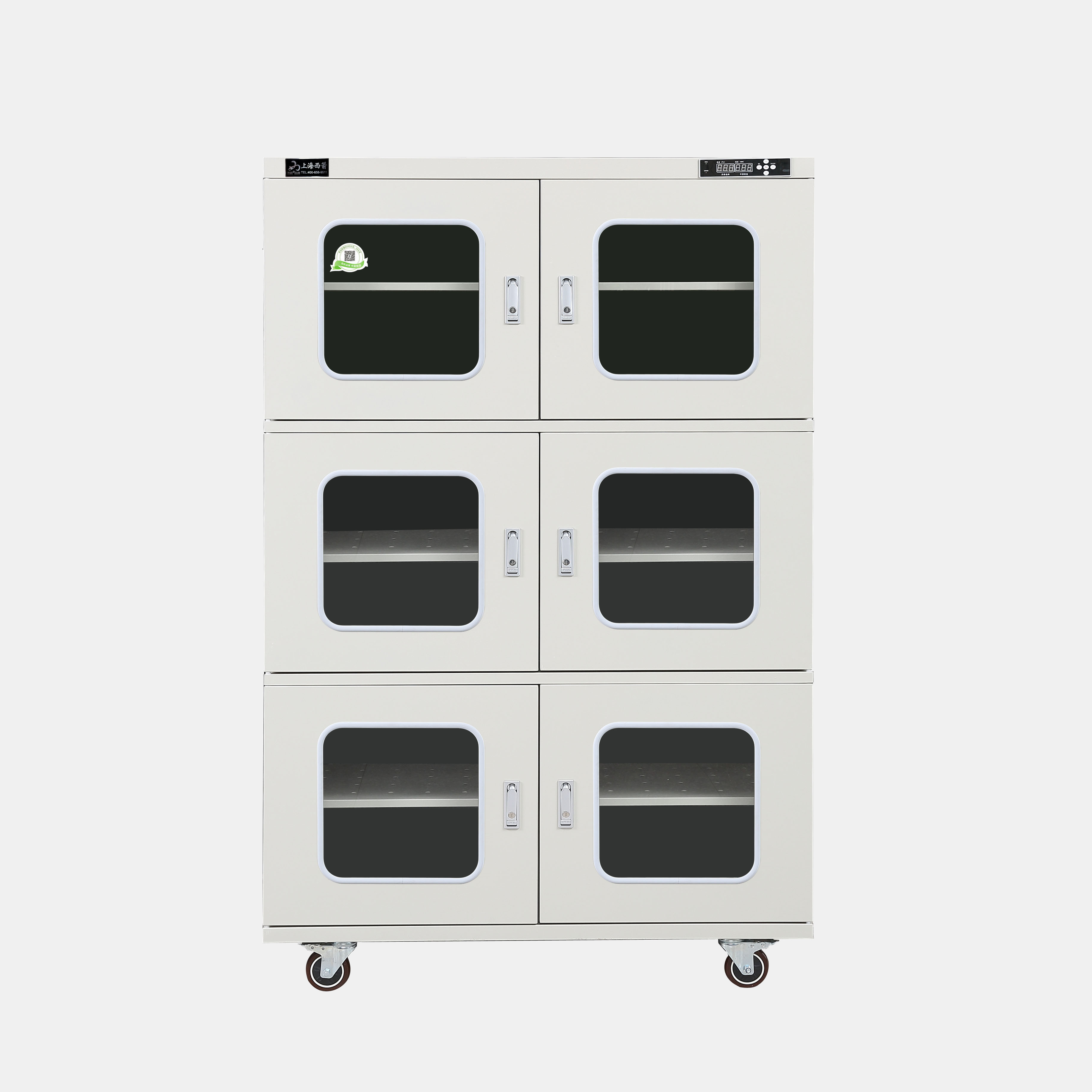 3.防潮箱門玻璃區域選用3.0mm鋼化玻璃,防前傾耳式結構設計。帶平面加壓把手鎖*體化設計,有防盜功能。**部安裝可移動帶剎車腳輪方便移動及固定(防靜電機型腳輪為防靜電)。