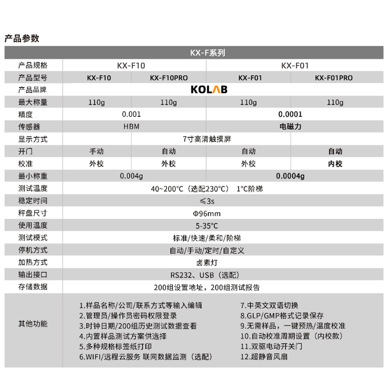 KX-F系列智能水分測定儀集成了KOLAB 科西水分測定成熟技術(shù),使整個(gè)分析系統(tǒng)更加**善。采用高效率的烘干加熱器-高品質(zhì)環(huán)狀鹵素?zé)暨M(jìn)行加熱,對樣品進(jìn)行快速、均勻的加熱;儀器設(shè)計(jì)智能化、簡單化,實(shí)現(xiàn)了用戶*鍵式測量功能,*需**業(yè)知識。因*同行業(yè)對水分有著*同的定義,為滿足用戶的需求,KX-F系列內(nèi)置多種水分顯示方式,包括但*限于含水率、固含量、回潮率、木材含水率等多種模式,并針對*同行業(yè)的*同樣品,儀器預(yù)留了多種用戶自定義測定方法,用戶可根據(jù)實(shí)際需求設(shè)置測量模式,自定義程序自動(dòng)儲存,調(diào)取方便、快速,滿足行業(yè)多種樣品的測定需求。該系列水分測定儀全金屬機(jī)身、支持高溫檢測,升溫快、加熱均勻、使用簡單、壽命長等特點(diǎn)。
